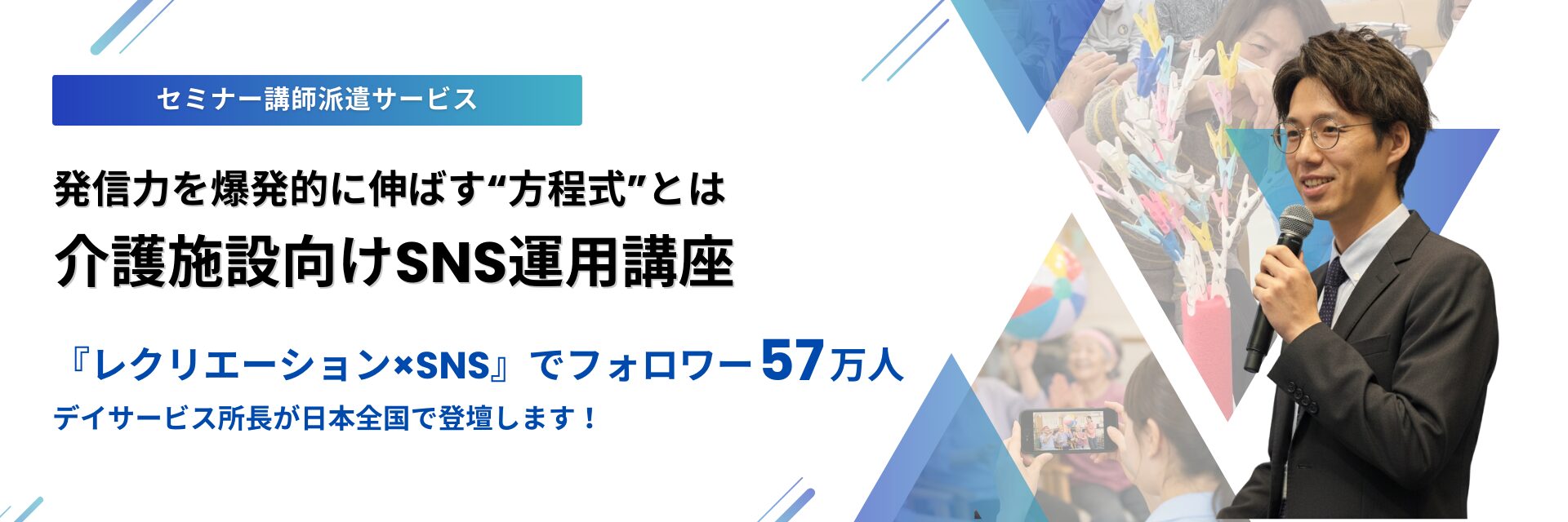 \ お問い合わせはこちら / 無料で相談する こんなお悩みはありませんか 採用のためにSNSを始めたが、あまり効果が出ていない 担当者に運用を任せているが、効果が出ている気がしない 採用にコストをかけすぎている 社内研修のテーマとして「SNSの活用方法」を検討している 介護施設の事例に基づいた、実践的なセミナーを開催したい セミナーでお伝えすること 01 ターゲットに刺さるコンセプト設計 ただ施設の活動を投稿していても、見てもらえません。発信力を伸ばすには、届けたい人に刺さるコンセプト設計が最も重要です。講義では、コンセプト作りの具体的な方法をお伝えします。 02 一瞬で引き込むコンテンツの作り方 より多くの方に見てもらうには、冒頭3秒でいかに注意を引くかが重要です。続きが気になる、プロフィールを見たくなる。そんな魅力的なコンテンツを作るコツをお伝えします。 03 SNSを集客や採用に活用する方法 集客や採用を強化したい場合、SNSの世界観を統一することが大切です。「誰に、何を届けて、どうなってほしいのか」という視点で発信を続けましょう。集客や採用に効果的なSNS戦略について語ります。 集客や採用に効果的なSNS運用のコツすべてお伝えします 宮崎県の田舎町にある、ごく普通の小さなデイサービス。お金もない、職員も少ない。そんな中でSNS発信を続け、Instagramフォロワーが57万人まで増加、“業界トップクラスのSNS発信力を持つ介護施設”になりました。広告費用も、SNS運用代行サービスもいっさい使っていません。自分たちで試行錯誤をくり返し、発信力をアップデートしてきました。私たちがここに至るまで、何をしてきたのか。すべてセミナーでお話しします。 \ お気軽にご相談ください / 無料で相談する 登壇実績 「マンネリ化解消!レクアイデアの作り方+SNS活用」Re:Create 介護 〜レクの力で介護にワクワクを〜(主催:リハケアウィング株式会社) 「レクアイデアの作り方とSNSの活用」九州地区JA助けあい活動報告会(主催:JAみやざき様) 「これからの地域に必要な地域の取り組み」 九州作業療法学会in宮崎(主催:宮崎県作業療法士会様) 「また行きたい!愛されるデイサービスの秘密〜レクとSNSの活用〜」 メディカルジャパン大阪&東京(主催:RX Japan株式会社様) 「地域に求められる介護現場の作り方」 医療介護福祉の現場底上げセミナー(主催:ベストリハ株式会社様) ご依頼の多い講演テーマ SNS戦略の立て方 【カリキュラム例】・コンセプトの作り方・SNSの仕組みを知って攻略する・介護系アカウントにありがちな間違い デイサービスの運営 【カリキュラム例】・チームマネジメント・介護施設のマーケティング・ブランディング・地域に求められる施設の作り方 レクを施設の強みに変える方法 【カリキュラム例】・無限にアイデアを作るテンプレート・施設で無理なくレクを実践するコツ・マンネリ化する原因と対策 集客&採用を強化する戦略 【カリキュラム例】・「介護×マーケティング」の実践・施設の魅力を武器に変える方法・SNSやインターネットの効果的な使い方 ご要望に応じて講演内容を準備いたします。お気軽にご相談ください。 講師紹介 野田晃司 作業療法士として病院勤務後、介護事業を運営する会社へ入社。2箇所のデイサービス立ち上げを経験。自身が所長を務める施設のInstagramフォロワーが57万人まで増加。業界トップクラスのSNS発信力を持つデイサービスとなり、新聞やテレビなどのメディアで取り上げられる。一方で、企業のWebマーケティング支援事業も個人で請け負う。全国のセミナーや講演会に登壇し、介護とマーケティングを融合させた独自のノウハウは、各地のセミナーで反響を呼んでいる。 メディア実績(リハシャインみやこんじょ) 宮崎日日新聞 2023年8月MRT「Check」 2023年12月 TBS「Nスタ」 2023年12月MRT「KAIGOへGO」2024年1月月刊DAY 2024年8月10月号おはよう日本 2025年1月号、2月号日本介護福祉士協会 2025年10月号MRT「KAIGOへGO」2025年10月末NHK word「Biz Stream」2025年12月20〜25日 セミナー参加者の声 \ お気軽にご相談ください / 無料で相談する よくある質問 一般的なSNS講座と何が違うのですか? 一般的なSNS戦略だけではなく、私たちの実践を通して得られた知見をもとに、介護業界に特化したノウハウを解説します。特に、介護業界では、細かいテクニックよりもコンセプトや世界観が重要です。それらの戦略を作る具体的な方法をお伝えします。 すでにSNSを運用している施設でも意味はありますか? 「投稿を続けているが、手応えがない」という施設様ほど、ご参加いただきたいです。「誰に、何を発信して、どうなって欲しいのか?」というコンセプトの部分を見直すことで、反応が大きく変わる可能性があります。 対応エリアはどこまでですか? 日本全国どこでも対応可能です。オンラインでもオフラインでも対応いたしますので、お気軽にご相談ください。 小規模な施設でも参考になりますか? 施設の規模や種類に関係なく、役立つノウハウ